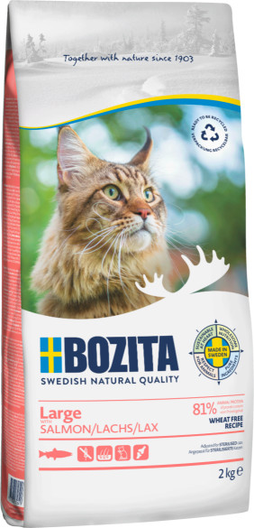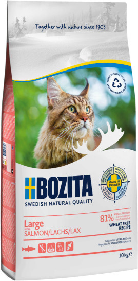 Bozita Large mit Lachs Katzenfutter ist ein komplettes, weizenfreies Futter mit köstlichem, frisch zubereitetem Lachs. Ideale Nahrung für große und langhaarige Katzen!