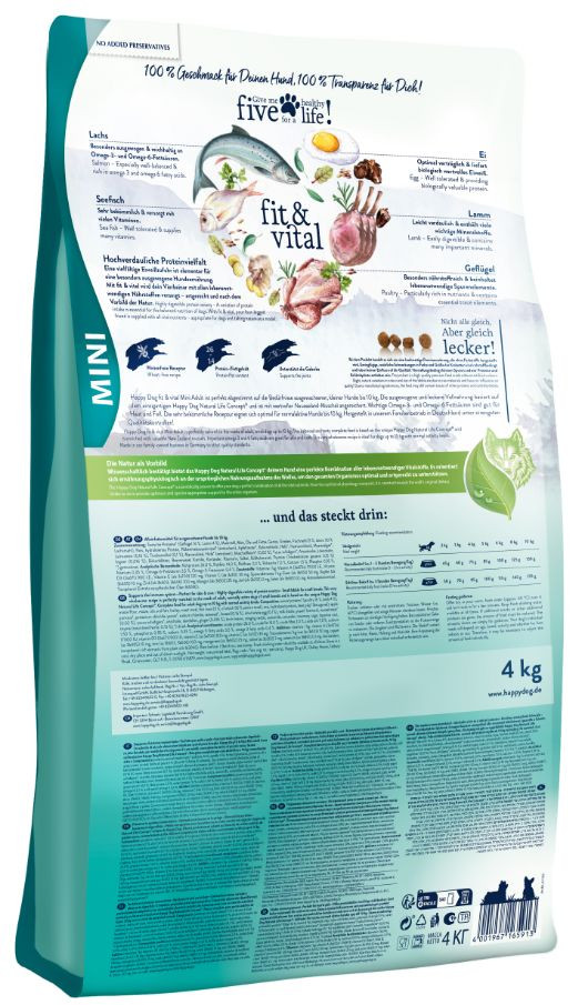 Happy Dog Fit & Vital Mini Adult Hundefutter ist geeignet für erwachsene Hunde bis 10 kg. Dieses Futter enthält eine ausgewogene Zusammenstellung an Proteinen.