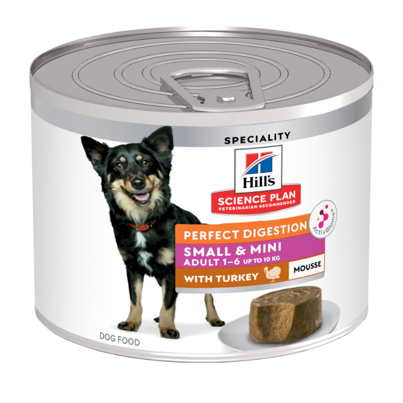 Hill's Science Plan Adult Perfect Digestion Small & Mini Mousse mit Truthahn Nassfutter Hund (200 Gramm Dose) wurde speziell für erwachsene Hunde kleiner Rassen zusammengestellt, die zu Verdauungsproblemen neigen. Mit der speziell entwickelten ActivBiome+Technologie trägt das Futter zu einer gesunden Darmflora bei und unterstützt eine normale Verdauung. Dies ist wichtig für Hunde, die einen empfindlichen Magen haben oder unter unregelmäßigem Stuhlgang leiden.